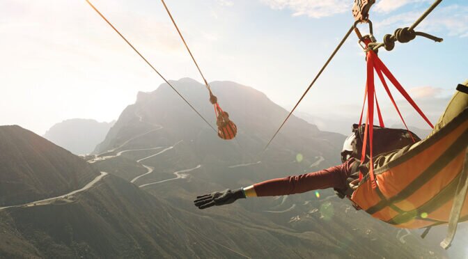The Hajar Mountains are an ever-present backdrop, especially as we follow the winding mountain road to the adventure park, where the zipline is based. At 1.75 miles long, 1,680 metres above sea level and capable of reaching 100mph, it's a thrilling two-minute ride over the valleys.