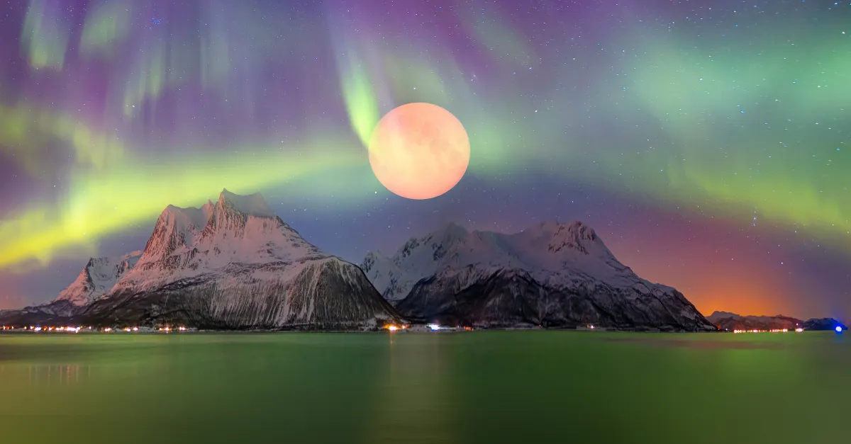 Northern lights (Aurora borealis) in the sky with lunar eclipse in Tromso, Norway