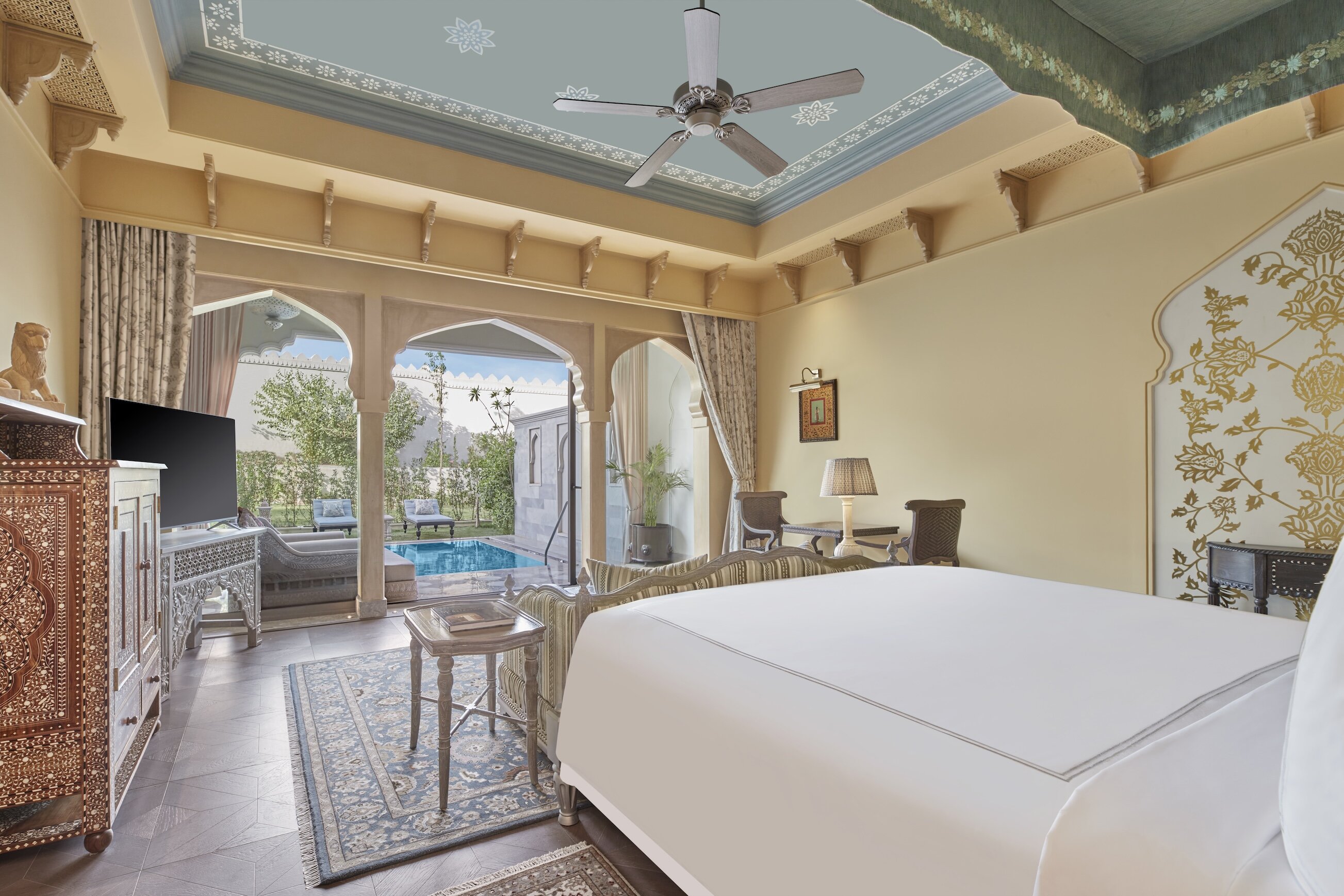 Situated a short drive from the famous 'Pink City' of Jaipur and encircled by the ancient Aravalli Hills, the newest addition to Raffles' portfolio aims to showcase the finest of Rajasthani craftsmanship. Each element within the reimagined palace retreat has been handcrafted by skilled artisans, blending the age-old traditions and techniques of Mughal and Rajputana architecture.