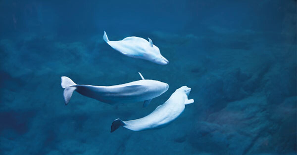 Below the water's surface, we're transported to another world, one where ghostly, white beluga whales swim around us, some playful, some curious, coming up close to see what this oddity is.