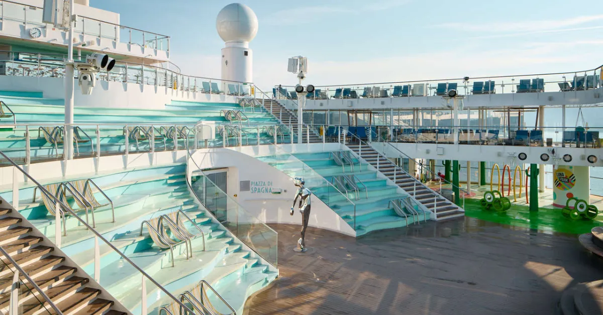 As the line’s LNG‑powered flagship, Costa Smeralda carries roughly 5,200 guests at double occupancy and features about 2,600 cabins, around 60% with balconies, including new “terrace” cabin types with extended verandas. Across 20 decks, guests find 13 pools and hot tubs, a large Organic Spa & Fitness complex, 11 restaurants and snack venues and 19 bars and lounges, many arranged around a central “Italian piazza” atrium. A big‑ship entertainment line‑up, including a main theatre, outdoor promenade and a glass‑bottom skywalk about 45 metres above the sea, underlines Costa’s lively, Italian‑flavoured, family‑friendly positioning – a contrast in style to the German and Gulf‑centric products sharing the region in 2026–27.