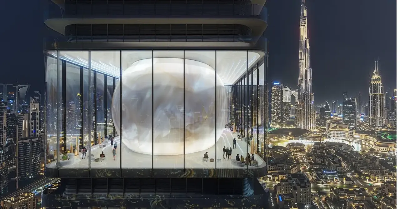 Located on the edge of Downtown Dubai with panoramic views of Burj Khalifa, the 42-storey, 200-metre-tall tower will include a striking central orb structure housing a social and dining hub with 360-degree views across Burj Khalifa, Business Bay and Dubai Mall.