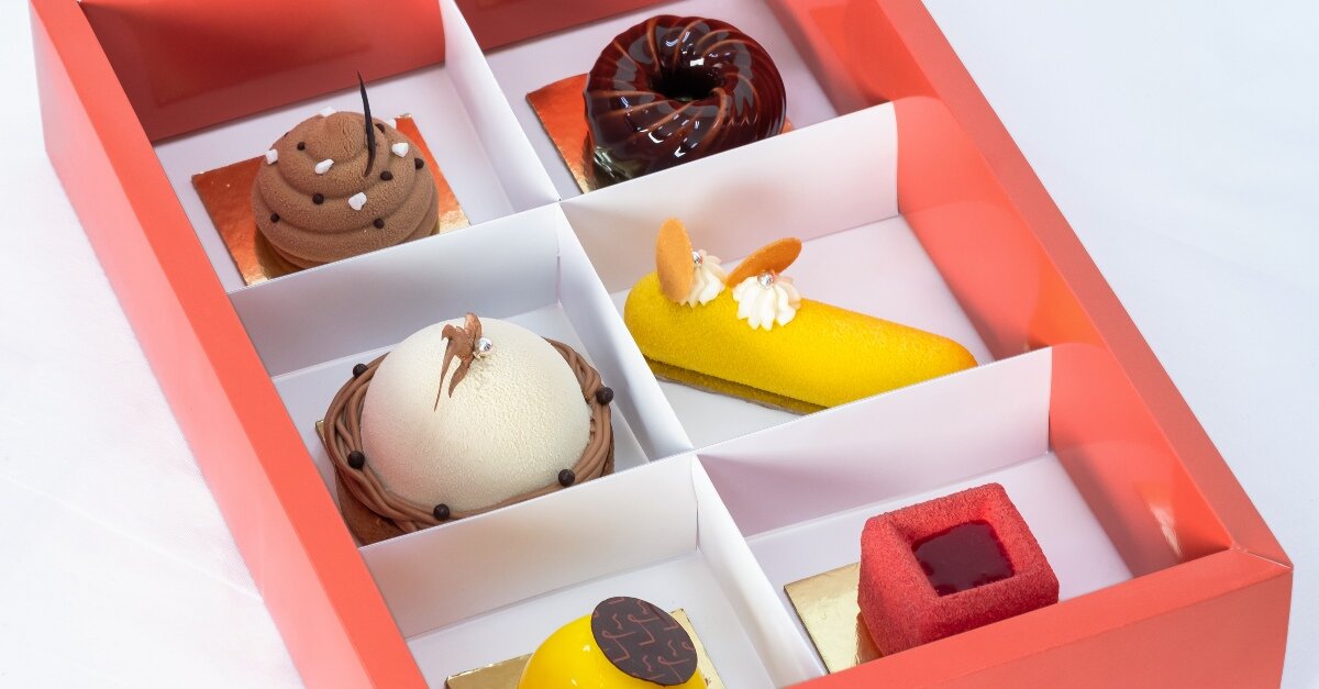 Flavours include 'Dark Circle', a rich dessert made with chocolate mousse, biscuit jaconde, hazelnut mousseline and chocolate glaze; the light and airy white chocolate and raspberry sponge cake, and 'The Petit Gateau', comprising almond sponge, mascarpone cream, mango, pineapple and raspberry.