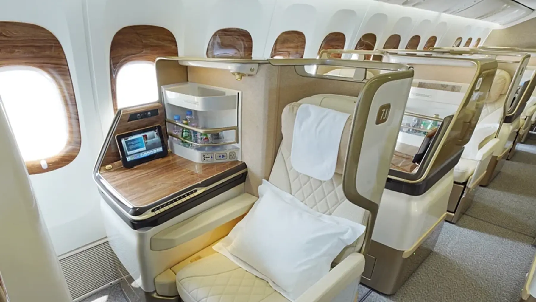 The new Emirates 777 Business Class cabin offers passengers 38 seats with soft leather cream upholstery accented with a champagne trim, lighter wood panelling and improved technology.
